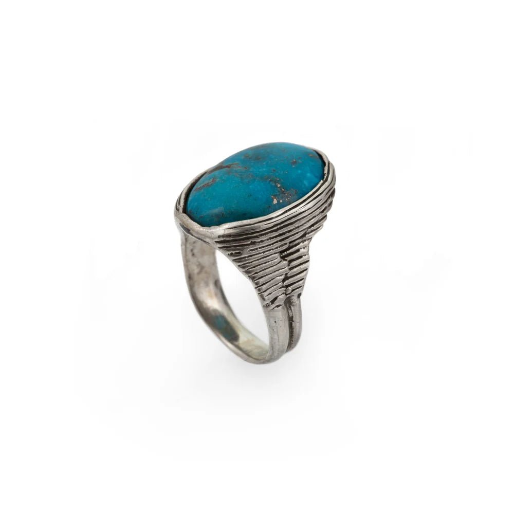 The Wing series was carved during one of Alex's trips to Morocco in the early 1970s. Two wings embrace a natural turquoise stone. The Little Wing Ring is an elegant addition to any Alex Streeter collection.